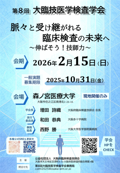 大臨技医学検査学会 ホーム大臨技医学検査学会第8回 大臨技医学検査学会 第8回 大臨技医学検査学会 トップ あいさつ 開催概要 運営スタッフ 実務委員募集 演題募集 演者の方へ 企業協賛 プログラム 府民公開講座 アクセス リンク お問合せ WEB抄録集 学会参加申し込みサイト(準備中) What’s new 2025/10/01 学会ホームページ開設しました! 2025/09/16 学会SNSが開設されました! Instagram ・ Facebook 登録してね😊 学会ポスターダウンロード 学会事務局 〒543-0018 大阪市天王寺区空清町8-33 大阪府医師協同組合東館 4階 公益社団法人 大阪府臨床検査技師会 TEL:06-6763-5652 FAX:06-6763-5653 トップ あいさつ 開催概要 運営スタッフ 実務委員募集 演題募集 演者の方へ 企業協賛 プログラム 府民公開講座 アクセス リンク お問合せ WEB抄録集 第8回大臨技医学検査学会 過去開催分
